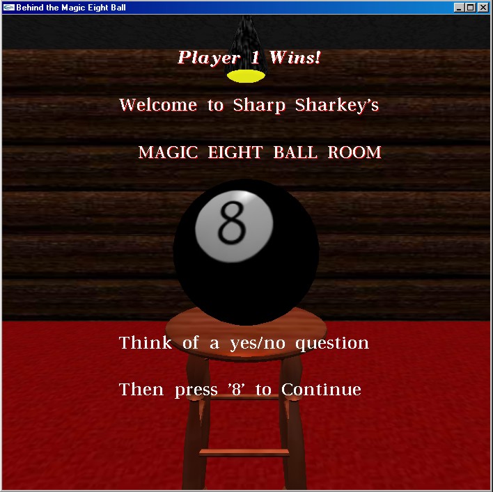 Behind the Magic Eight Ball is a realistic 3d pool game that allows a player to practice his shots to perfect his game or to challenge an opponent to a head-to-head duel. The incredibly realistic ball dynamics allow the user to do anything he would be able to do in a real game including applying different spins to the cue ball, shoot with varying amounts of power and spin, or even jump over other balls. The winner of a two-player game even gets a chance to visit the mysterious "Magic Eight Ball" room, where Sharp Sharkey's Magic Eight Ball holds the answers to all of life's questions.